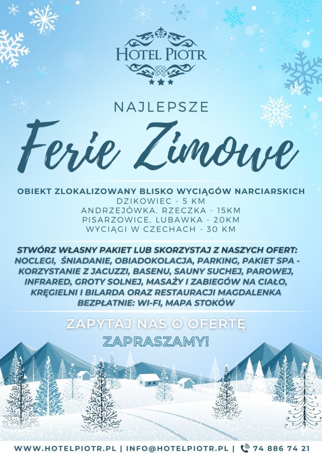 Nasza lokalizacja to wspaniałe miejsce do zimowych górskich wędrówek oraz jazdy na nartach na Górze Dzikowiec i innych okolicznych stokach po stronie polskiej oraz czeskiej. Z myślą o rodzinach chcących spędzić komfortowo wypoczynek w sezonie zimowym w malowniczym miasteczku - Boguszów-Gorce, Hotel Piotr SPA&Wellness przygotował specjalne pakiety noclegowe.